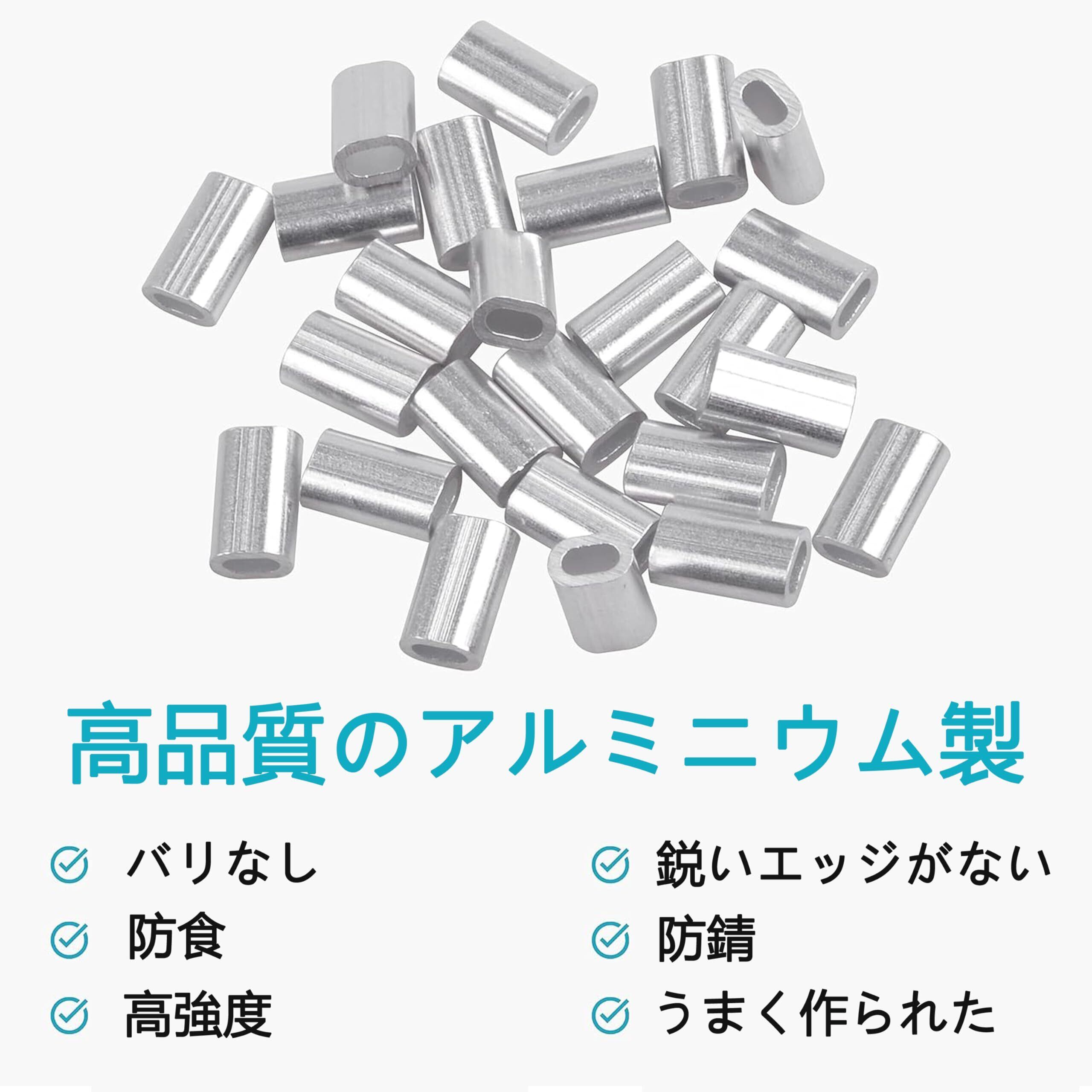 【耐久アルミスリーブ】:高強度アルミ合金で作られ、スリーブにワイヤーを通す際に、バリ防止のデザインです。耐荷重にすごく、ひび割れにくく、耐摩擦性、耐錆性、耐熱性、耐食性に優れるステンレスワイヤーロープです。