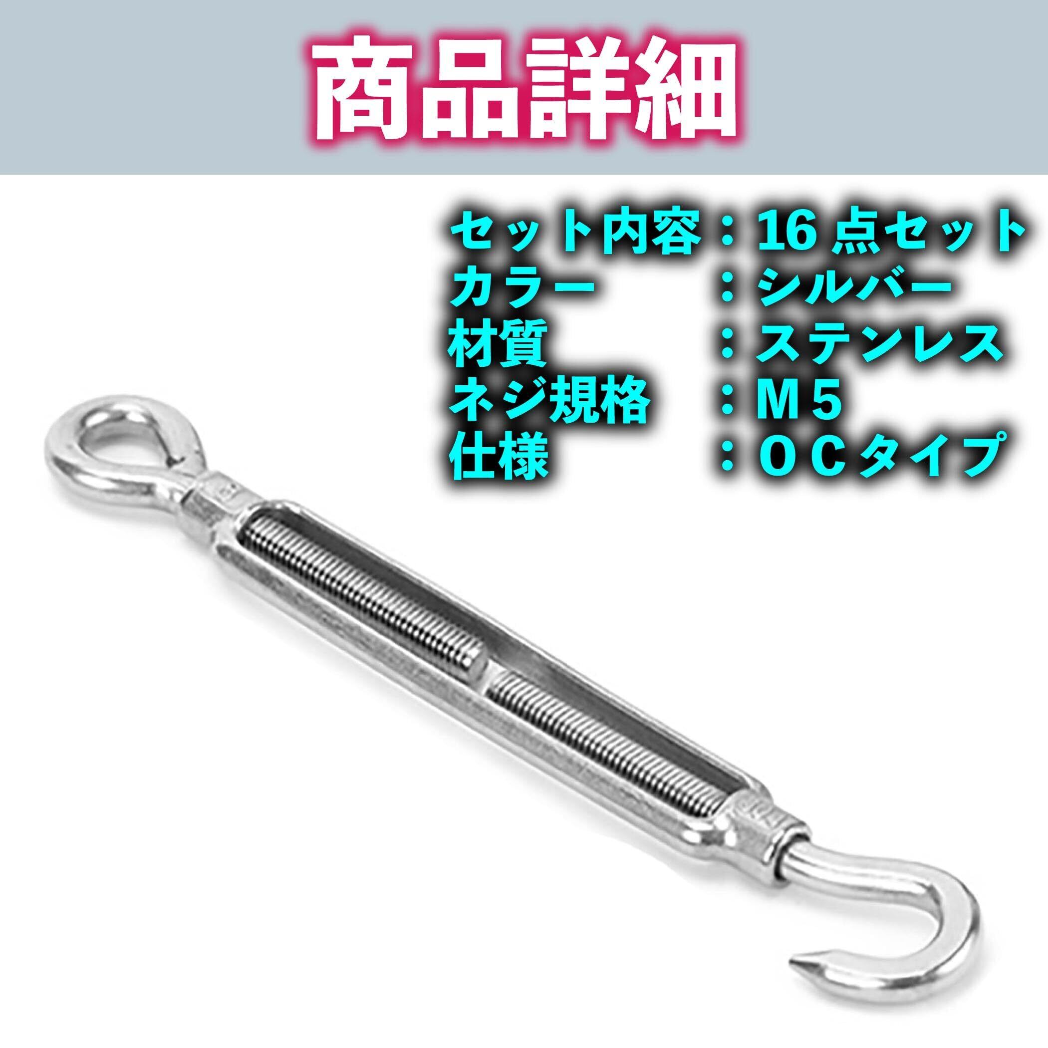 たくさん欲しい場合にも:OCタイプのターンバックルが合計16点揃ったセット品ですので、強風対策や補強をしたい構造物が複数ある場合にもお使いいただけます。ネジ規格はM5となっています。