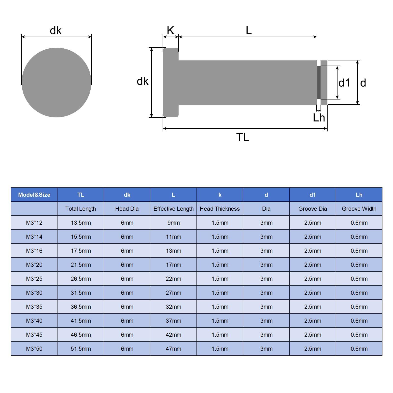 [サイズとパッケージ]: このシリップ位置決め円筒ピンの溝幅は0.6mm/0.02"、溝直径は2.5mm/0.1"、ヘッド厚さは1.5mm/0.06"、有効長は37mm/1.46"、ヘッド直径は6mm/0.24"、全長は41.5mm/1.63"、直径は3 mm/0.12"、仕様はM3x40mmで、パッケージには10個の円筒ピンと10個のブロッキングプレートが含まれています。