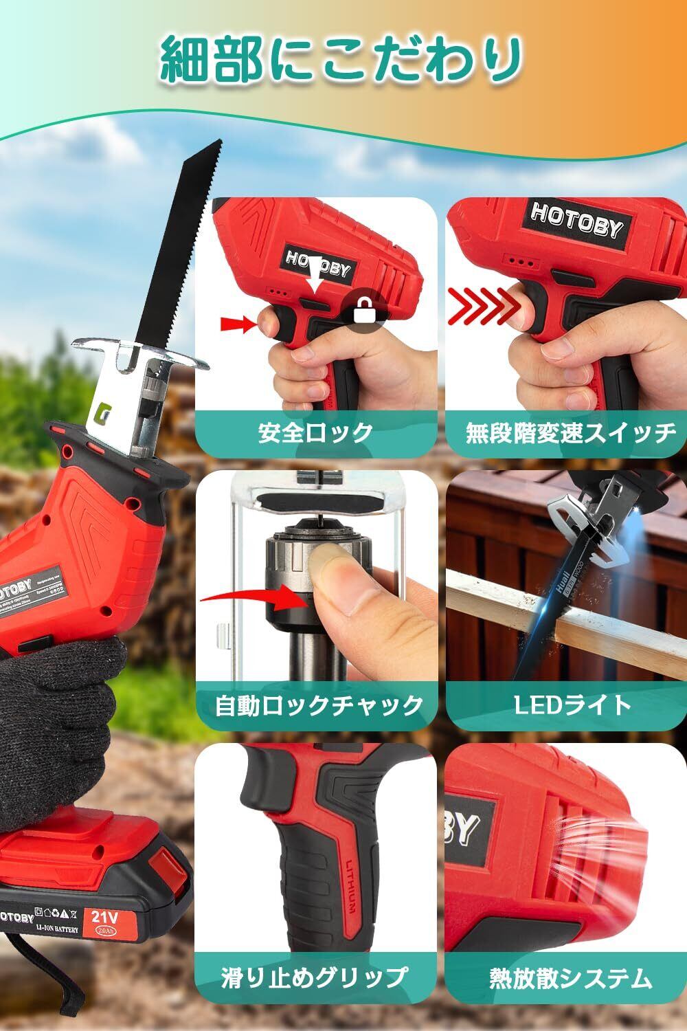 【安心なサポート、2種類の刃で様々な用途に対応!】木工用と鋼鉄用ブレードを2種類ご用意しております(総計8本)。ニーズに応じ、ブレードを選択でき、様々な用途に対応できます。庭木の枝打ち、枝の剪定や木材、金属、プラスチック製パイプなどの切断、粗大ゴミ解体をコレ1台で十分!安心なサポートも付いています。本製品は購入日より半年の期間があります。万が一商品に何か不具合または質問があったらお気軽にご連絡ください。お客様は満足できるよう全力を尽くしていきます。