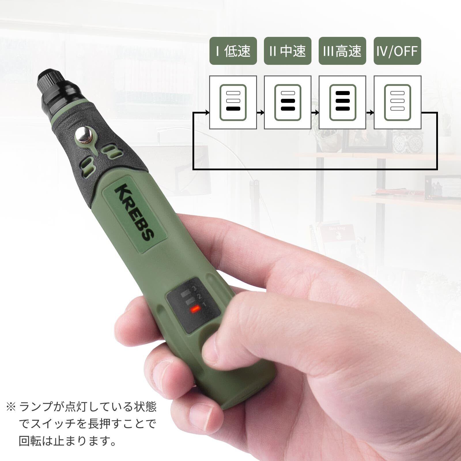 KREBS(クレブス) 充電ミニルーター(リューター)3.6V コードレス 超軽量 3段変速 最高15000rpm ビット31点セット 彫刻/研磨/切削/穴あけ/汚れ落とし/つや出し
