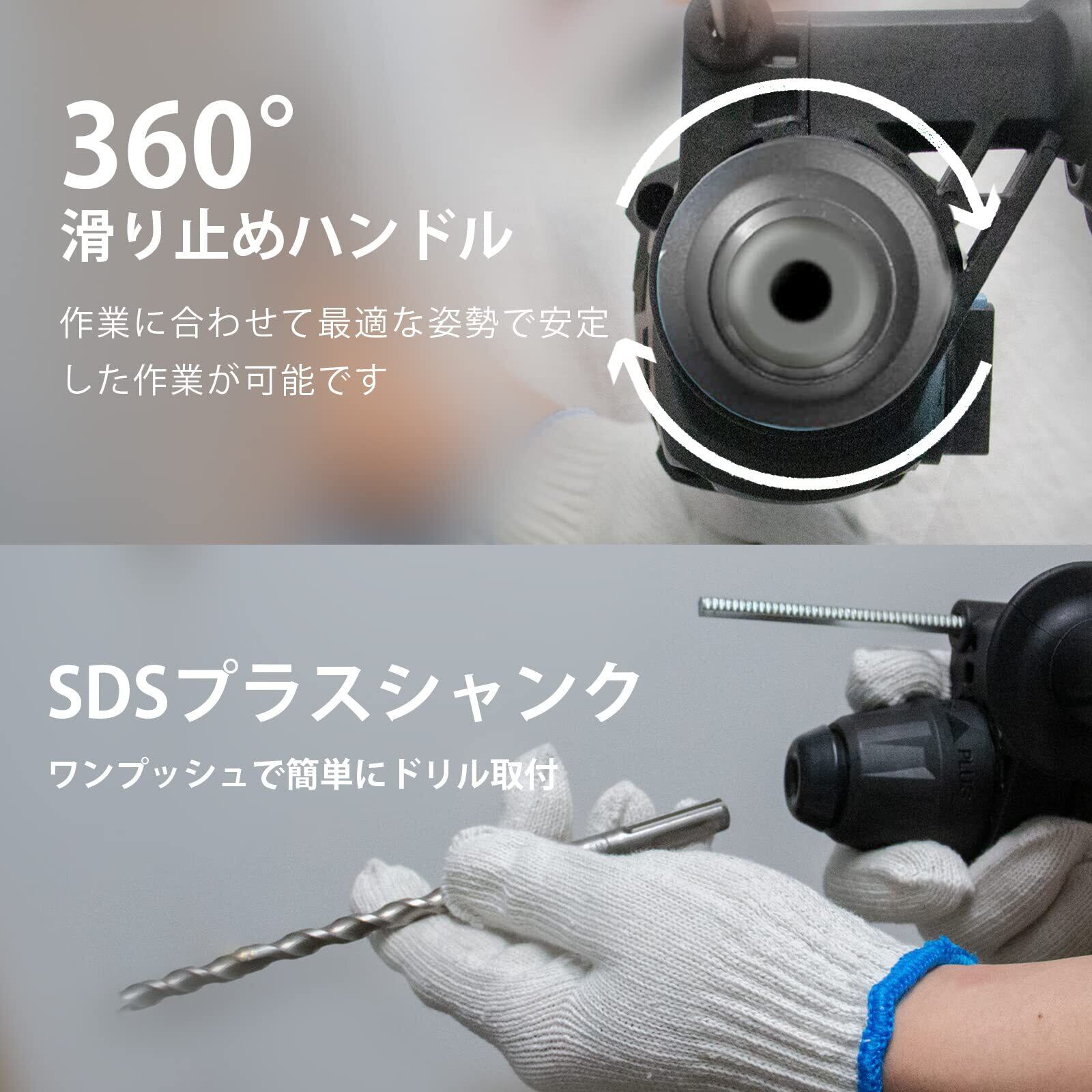 【SDSプラスシャンク&360の回転グリップです】SDS-Plusシャンクには、振動ドリル、しゃくり溝の設計で最高のチャッキングを提供して、作業中に滑り止めます。SDSプラスシステムでワンタッチでドリルビットを取り付け·取り外すことが可能です。そして、下部の黒いカバーを取り外すだけで、付属のカーボンブラシが交換できます。強力な打撃は螺旋駆動方式(パワートランスデューサー)を採用し、本体の小型・軽量化を実現しました。人間工学に基づいた360回転式グリップですより快適に仕事の姿勢やコンディションを整えることができ、さまざまなシーンに対応できます。