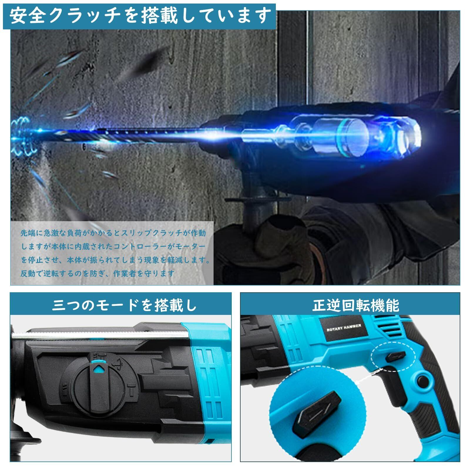 【3モード切替可能】用途に応じて「回転」「回転+打撃」「打撃」に自由に切り替えます。木材、金属、セラミックタイルなどの穴あけ、壁と地面の解体、様々な作業に最適です。市販売の一つ回転スイッチより、当社の電動ハンマドリルは二つの切り替えスイッチのデザインで、使用年数を延長されることができます。