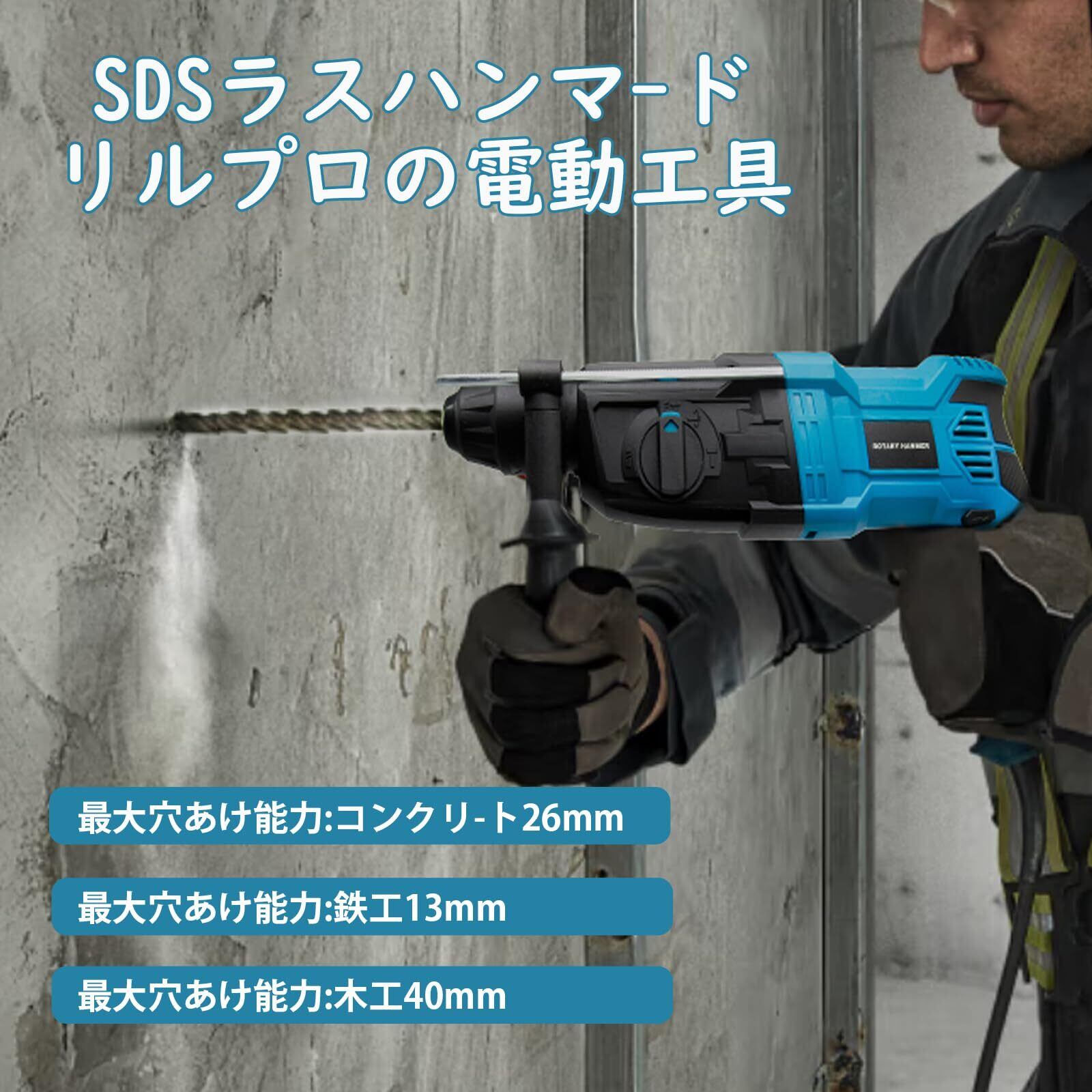 【特価商品】CXCESNS ハンマードリル 電動ハンマドリル 1100W 強力 110V コード式 低振動機構 無段階変速 3モード コンクリート26mm/鉄工13mm/木工40mm 電気ドリル 電気ハンマ SDSプラスビット5本 ドリルチャック1個 収納バッグ付き 日本語取扱説明書付き