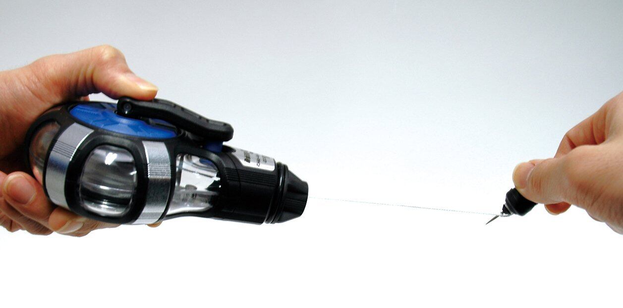 少ない力で長い距離でも素早く巻き取れる巻取速度5倍。粉付バツグンの特殊合成織糸採用で粉付3倍(メーカー比)。ドラムを押さえずにロックができ、ハンドルを押し込むと糸が引けるハンドルロック。透明度UPで粉残量が一目でわかるクリアボディ。チョーク粉をボトルから直接注げる大きなタンク口。