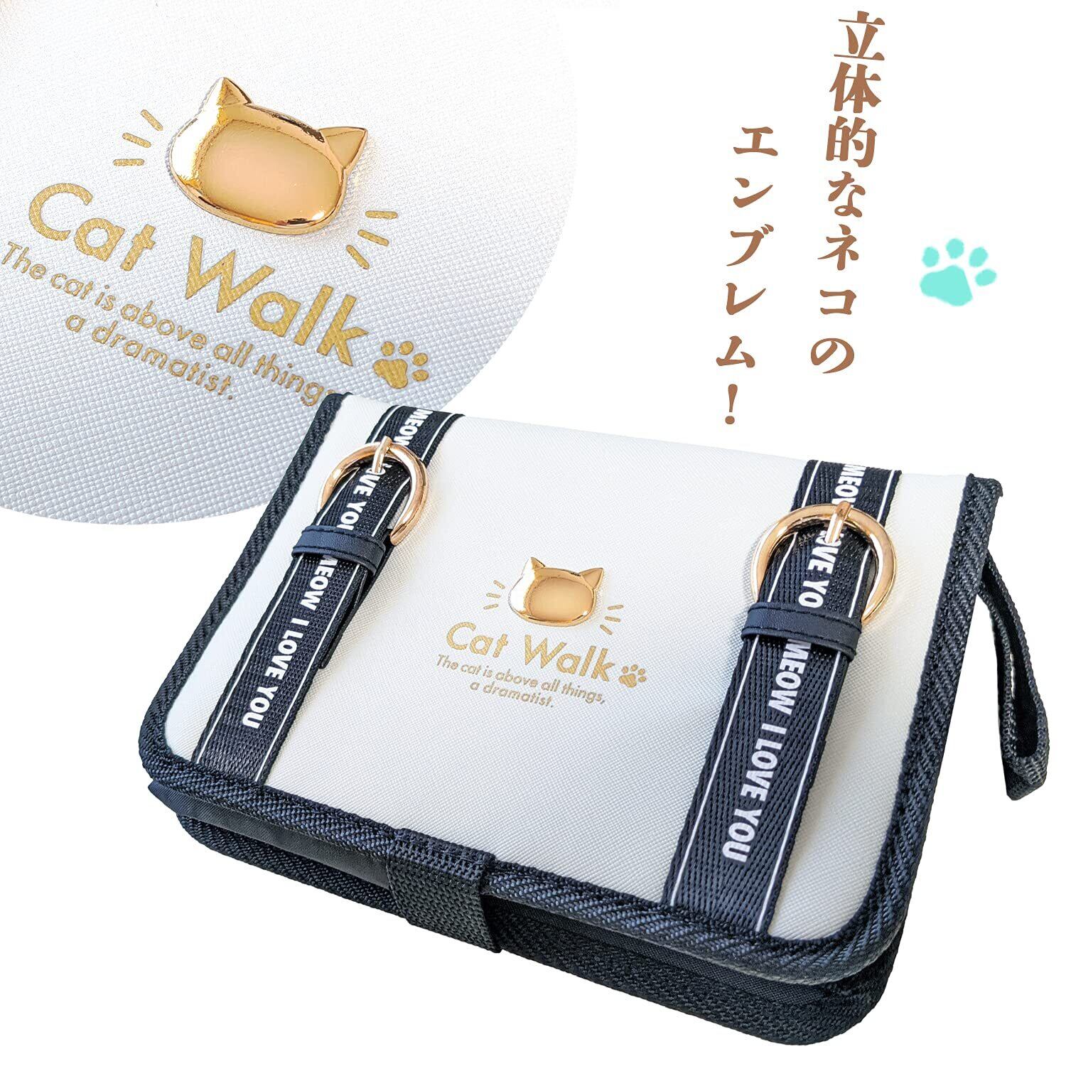 収納バッグは、立体的な可愛いネコの エンブレムがチャーミング。 ベルト風のゴールドのバックルも おしゃれなアクセントになっています。
