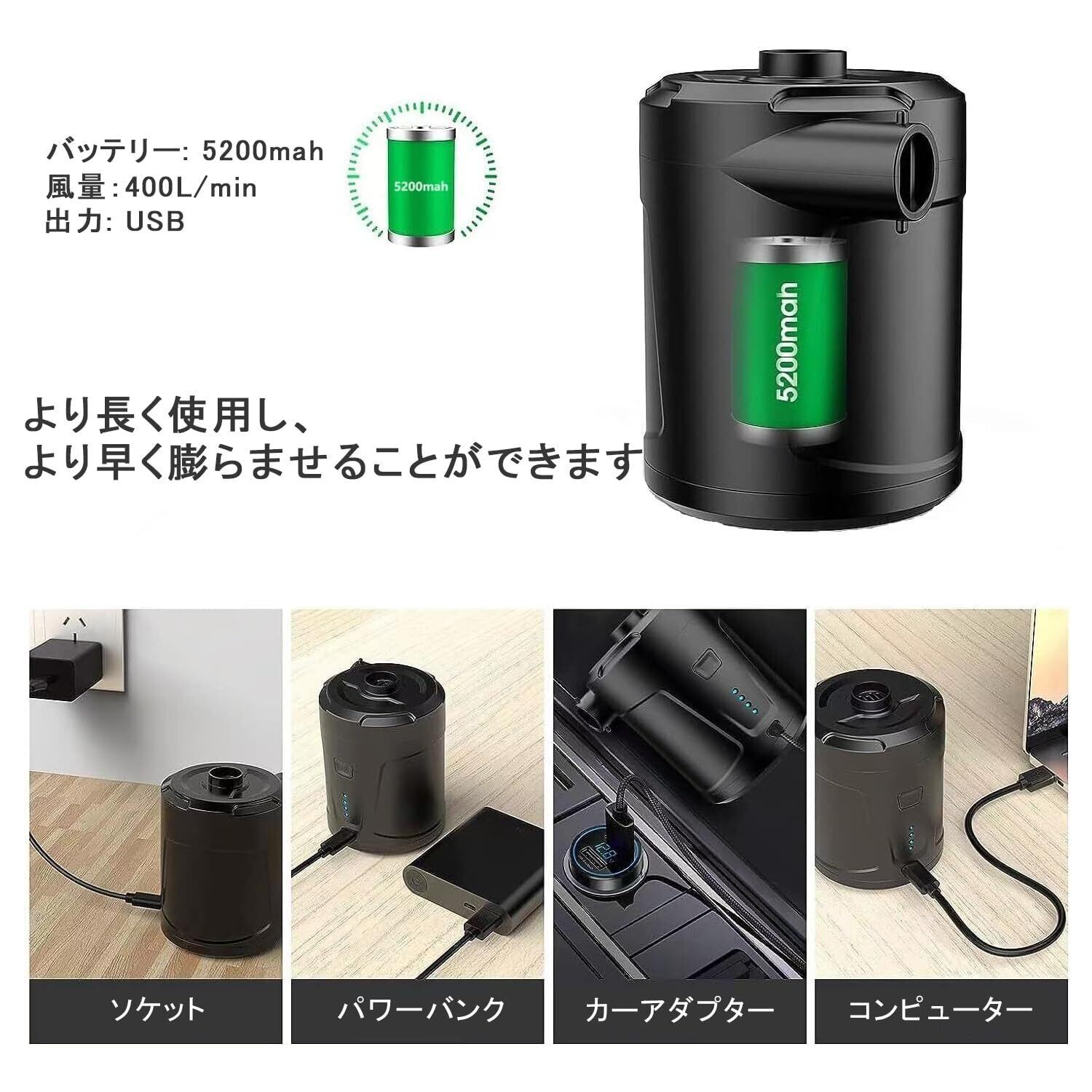 Tigwiss エアーポンプ 電動 空気入れ 超軽量 強力400L/分 【3つのノズル】 エアポンプ 5200mAh大容量バッテリー Type-C充電式 空気抜き インフレーターマット キャンプ 浮き輪