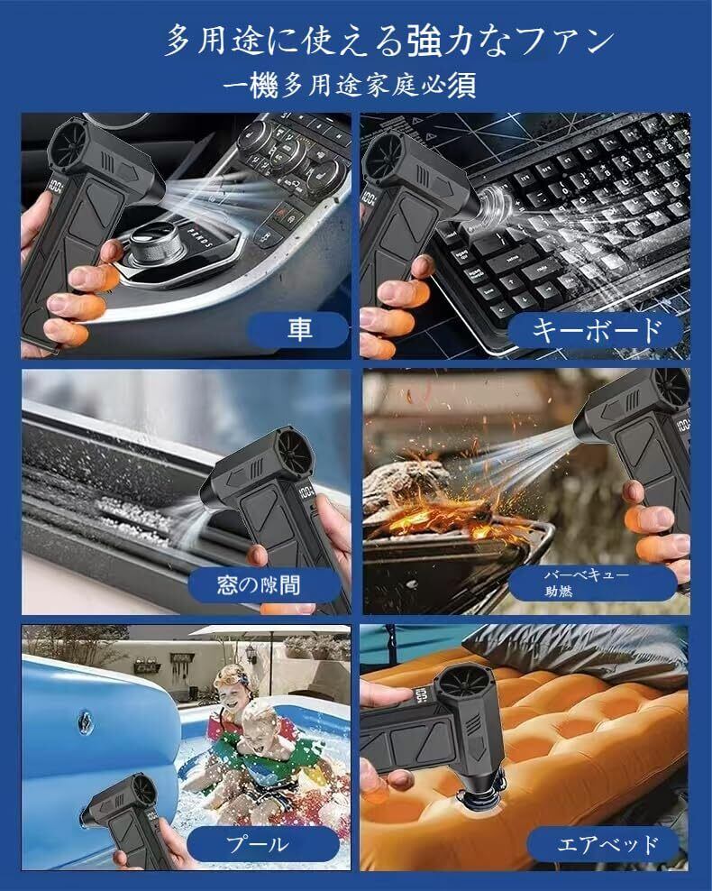【エアダスター&ハンディ掃除機】エアダスターは多機能を持っています、エアダスターが動作するとき、LED照明が正面にオブジェクトを照らすことができ、より効率的かつ便利なクリーニング。 また、送風機能だけでなく、フーバー機能も備えています。強力モーターを採用し、軽量・コンパクトでありながら強力な吸引力を実現しました。隙間のゴミも逃さず、しっかり吸い取ることができます。ダストカップとフィルターは簡単に取り外すことができるため、集めたゴミはさっと捨てられます。詳しくは日本語のマニュアルを参照してください。