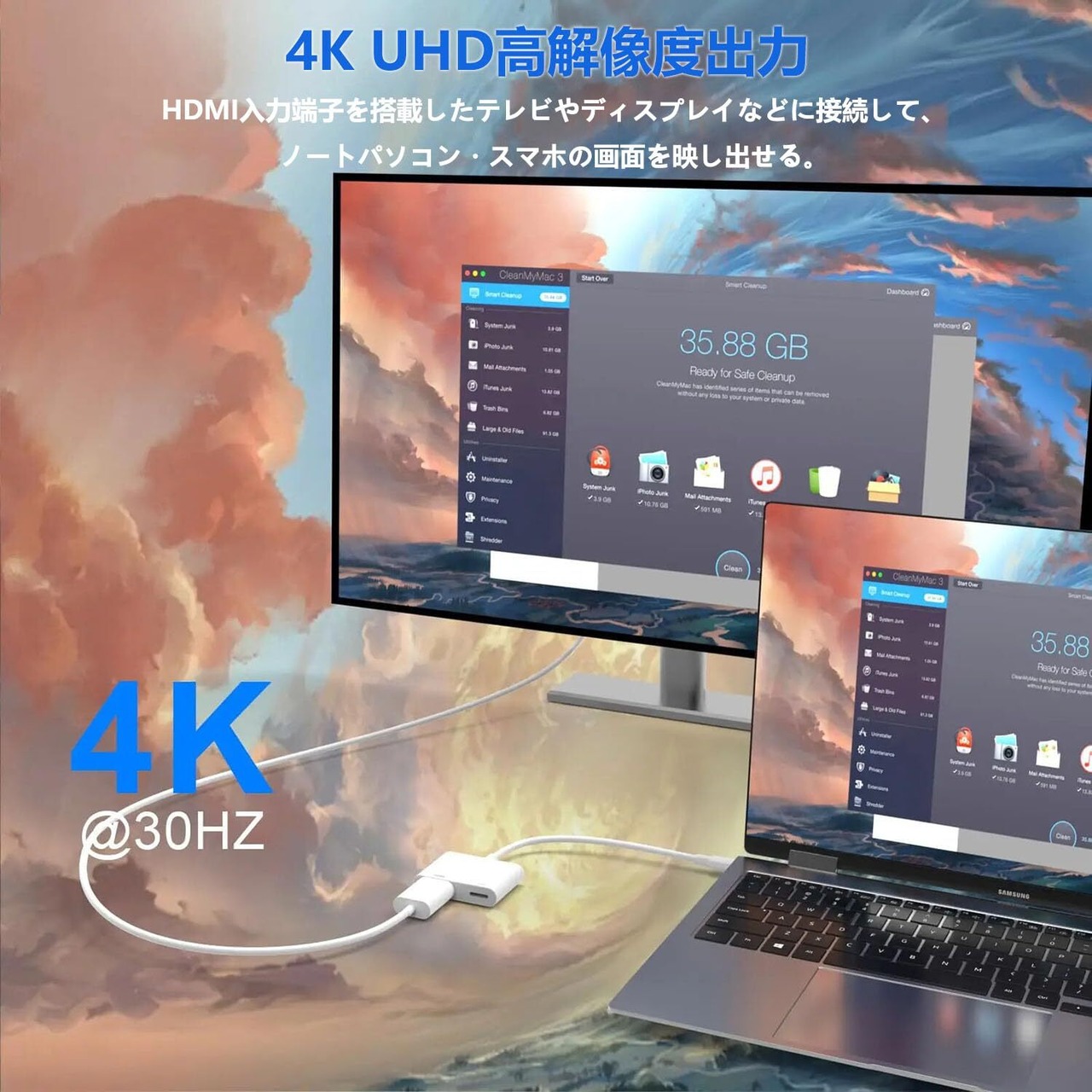 「4K UHD高解像度出力」:HDMI入力端子を搭載したテレビやディスプレイ、プロジェクターなどに接続して、ノートパソコン・スマホ・タブレットの画面を映し出せる。「拡張モード」と「複製モード」の2つの表示モードにも対応しています。作業スペースを広げて、効率的に作業できます。下位互換性を備えており、2Kや1080p、720pなどの出力にも対応しています。