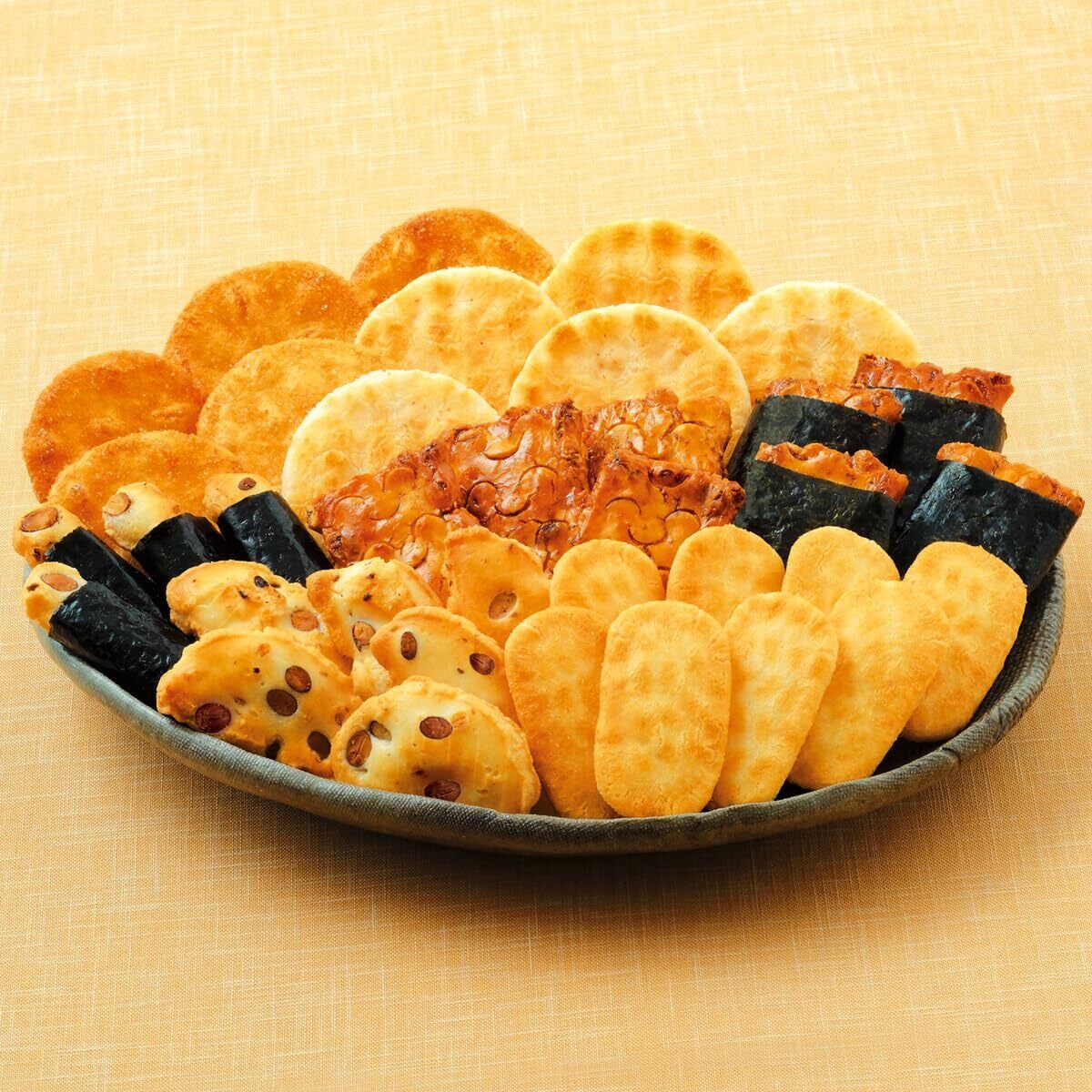 【7種38袋(43枚)】あまったれ(ざらめ味6枚)、ミニ小判(サラダ味5袋・10枚)、角もち(しょうゆ味5枚)、アーモンド入り(サラダ味8枚)、角もち海苔巻(しょうゆ味4枚)、ふくよか海苔巻(サラダ味4本)、えび入り(サラダ味6枚)