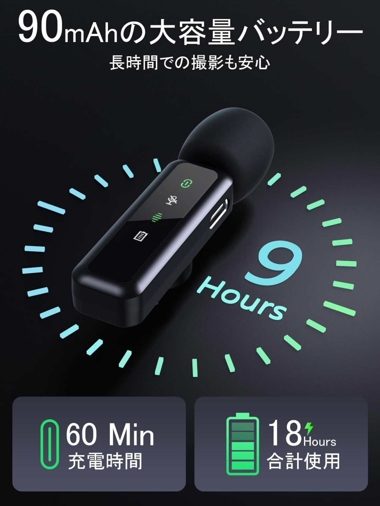 【大容量電池&操作簡単】配線の必要がなく!90mAhの大容量バッテリーが内蔵されており、わずか60分で完全に充電可能です。しかも、最大9時間の連続使用が可能になりました。ライブ配信やYouTube撮影、Vlogなど、長時間にわたる用途に最適なワイヤレスマイクです。レシーバーは電池不要で、プラグアンドプレイタイプなので、デバイスに挿すだけですぐに使えて、面倒な設定は一切ありません。大容量バッテリーと簡単操作を兼ね備えた、まさに究極のワイヤレスマイクが登場しました!️プラグアンドプレイタイプなので、複雑な手間がなく、デバイスの端子に挿入すると即時使用できます。