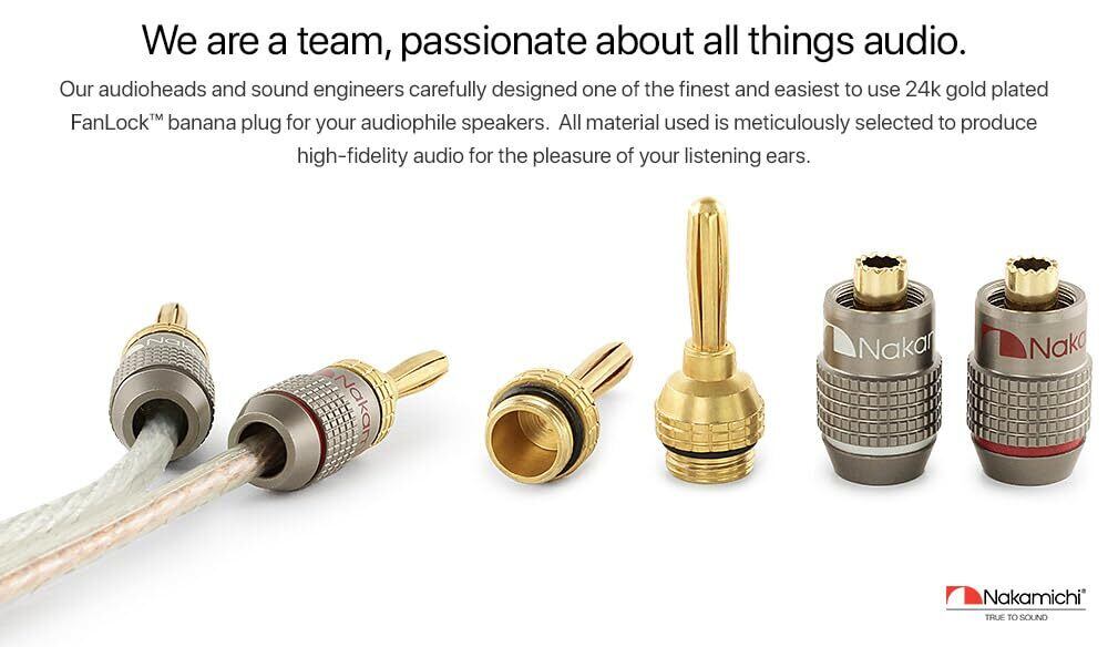 Nakamichi FanLock バナナプラグは、オーディオコンポーネントのバインディングポストにシームレスに直接フィットし、特にスペースが狭い場合に、スピーカーワイヤーをねじ込んだり緩めたりする手間を省きます。